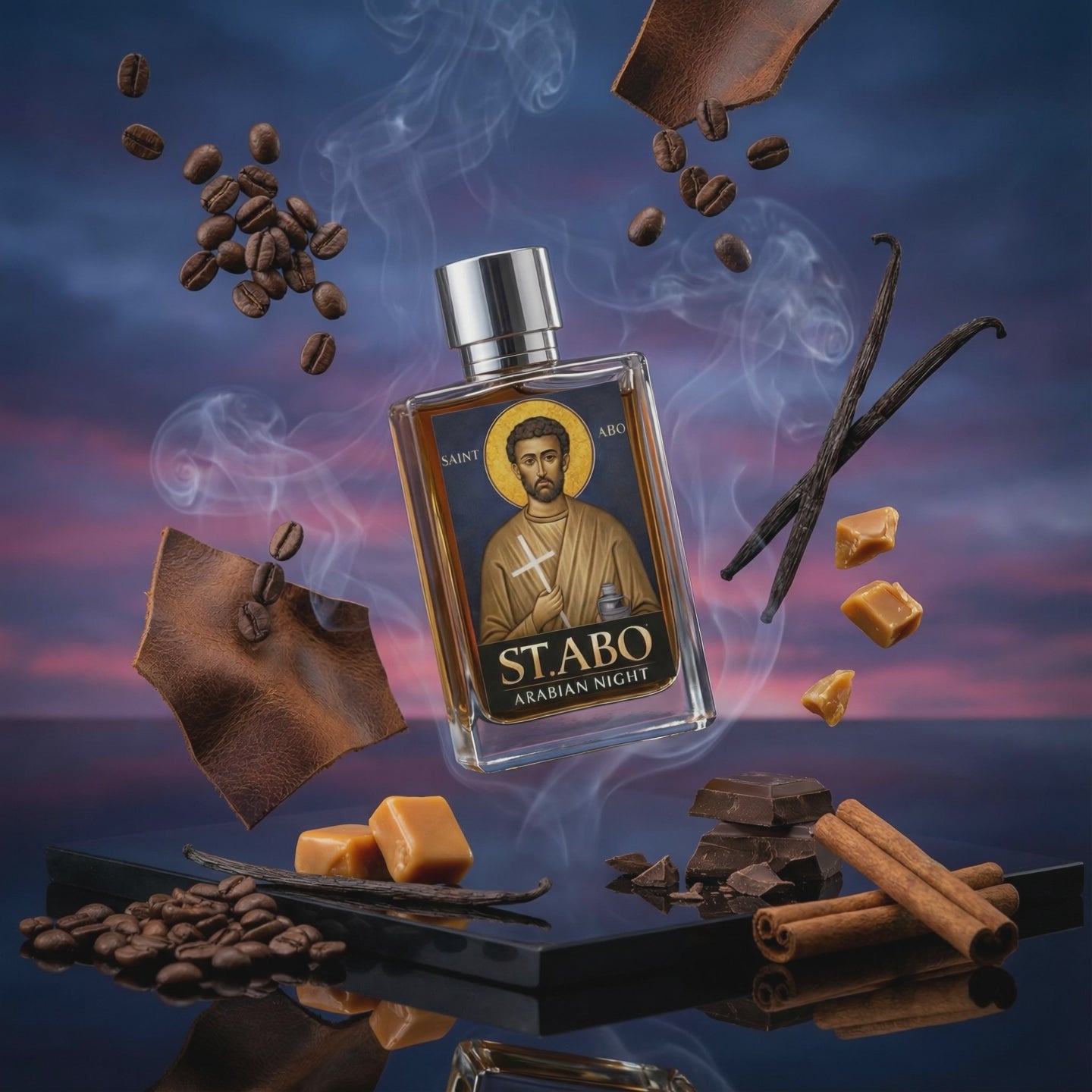 A dark, resinous tribute to the Perfumer Saint—a legacy distilled into smoke, spice, and faith.